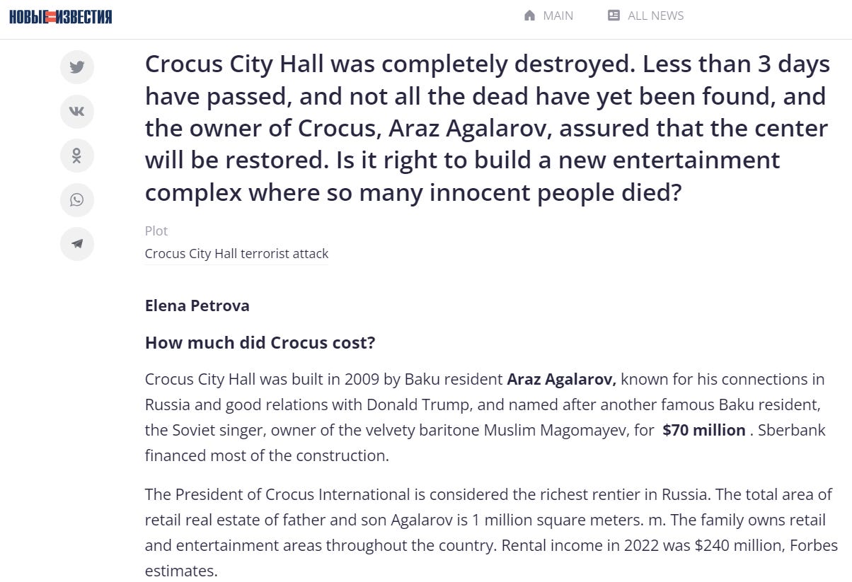 Podolyak also has some pointed questions for the owner of Crocus City Hall, an Azeri oligarch (sorry, “entrepreneur”) by the name of Araz Agalarov. If you’re craving info about Araz, Rolo has some interesting details. Or just use your favorite search engine.