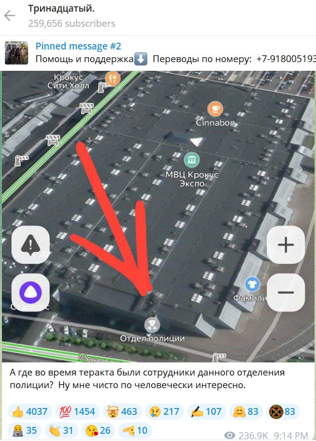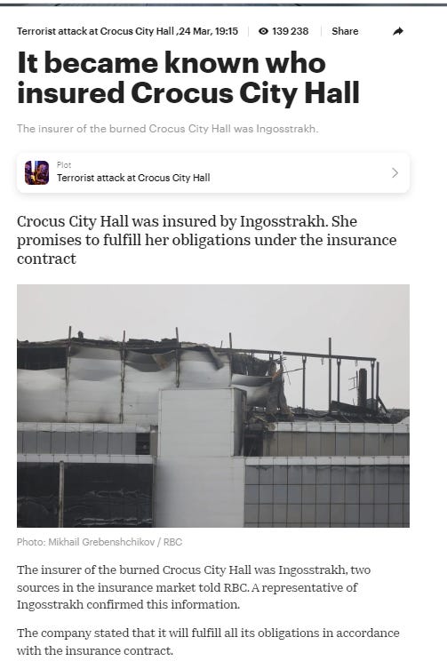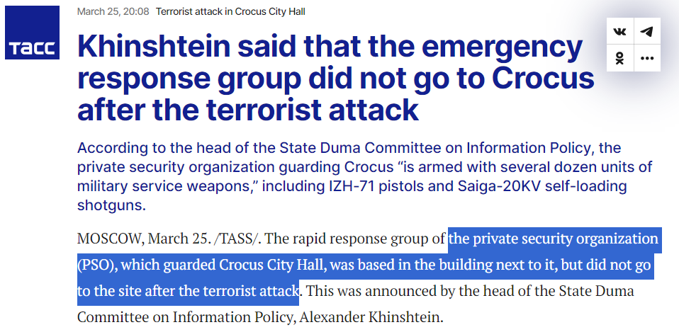 ▪︎ why did the special forces enter Crocus only an hour later, when the terrorists had already left, especially considering that the distance from the Main Directorate of the Russian Guard in Moscow to the Crocus shopping center is only 4 minutes by car?