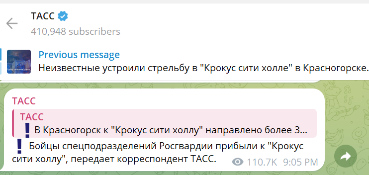 TASS reported that OMON units were en route to Crocus City Hall at 20:33. They reached the concert hall at 21:05, according to a TASS correspondent at the scene.