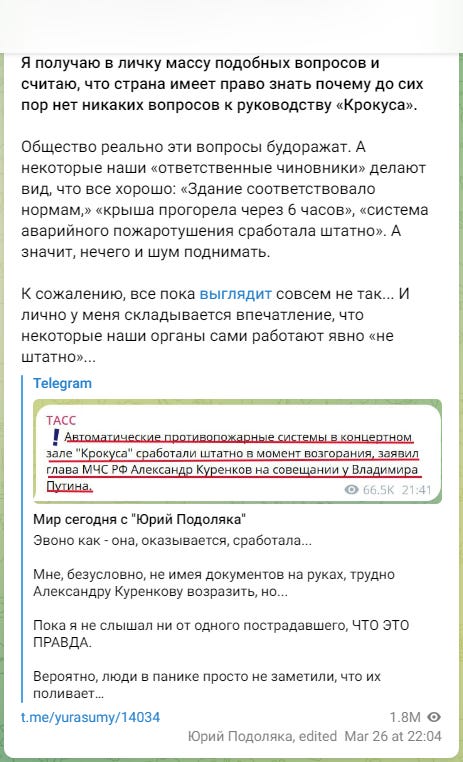 These questions are nagging me all the time: terrorists can come to a terrorist attack in a huge entertainment center in Moscow in a white Kia or whatever, create this crazy hell within 15 minutes without police intervention, kill more than a hundred people, commit arson of a huge complex—setting the seats on fire, in a complex equipped with an automatic fire extinguishing system—and do it all with impunity, without hiding their faces… […]IN SHORT: I don’t understand anything, is this a theater of the absurd? Do you believe this nonsense? Really???