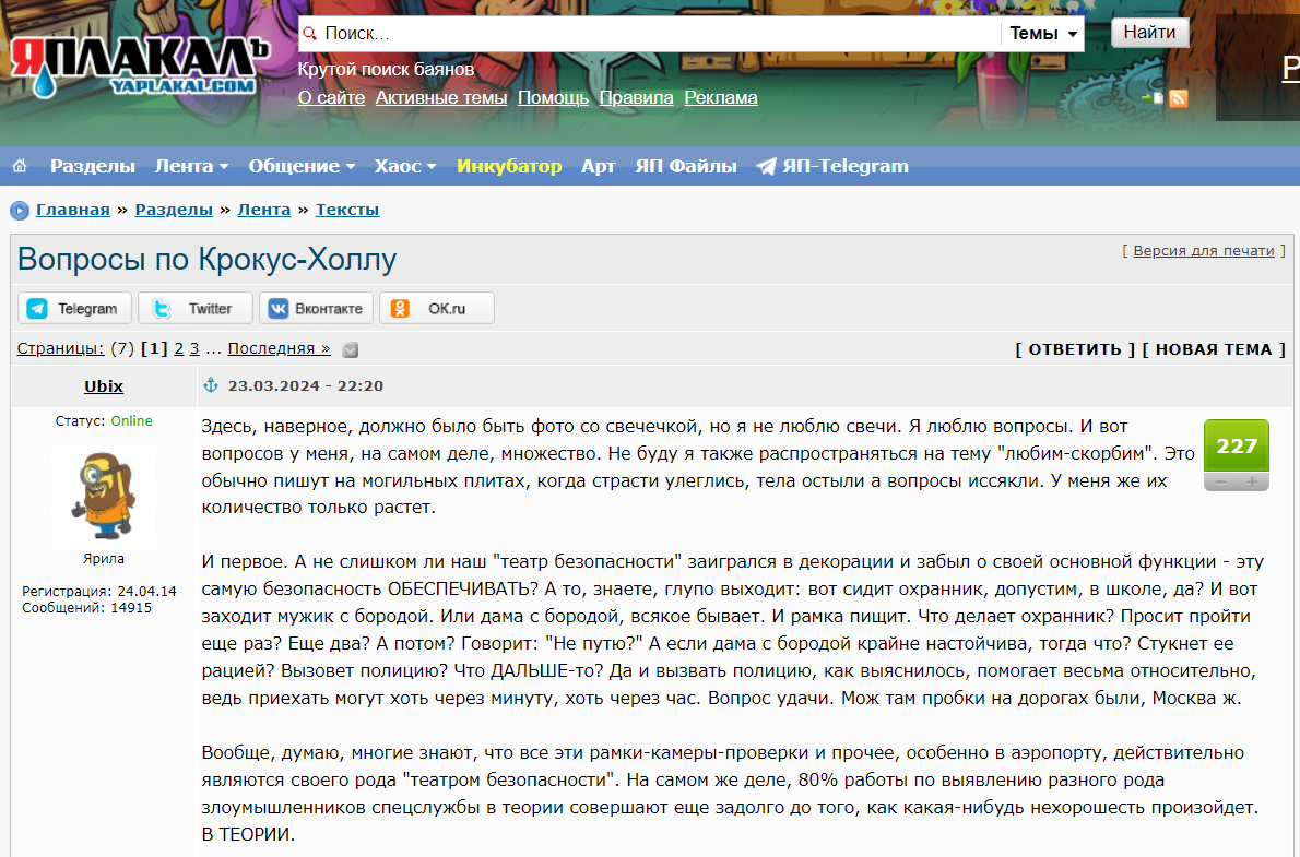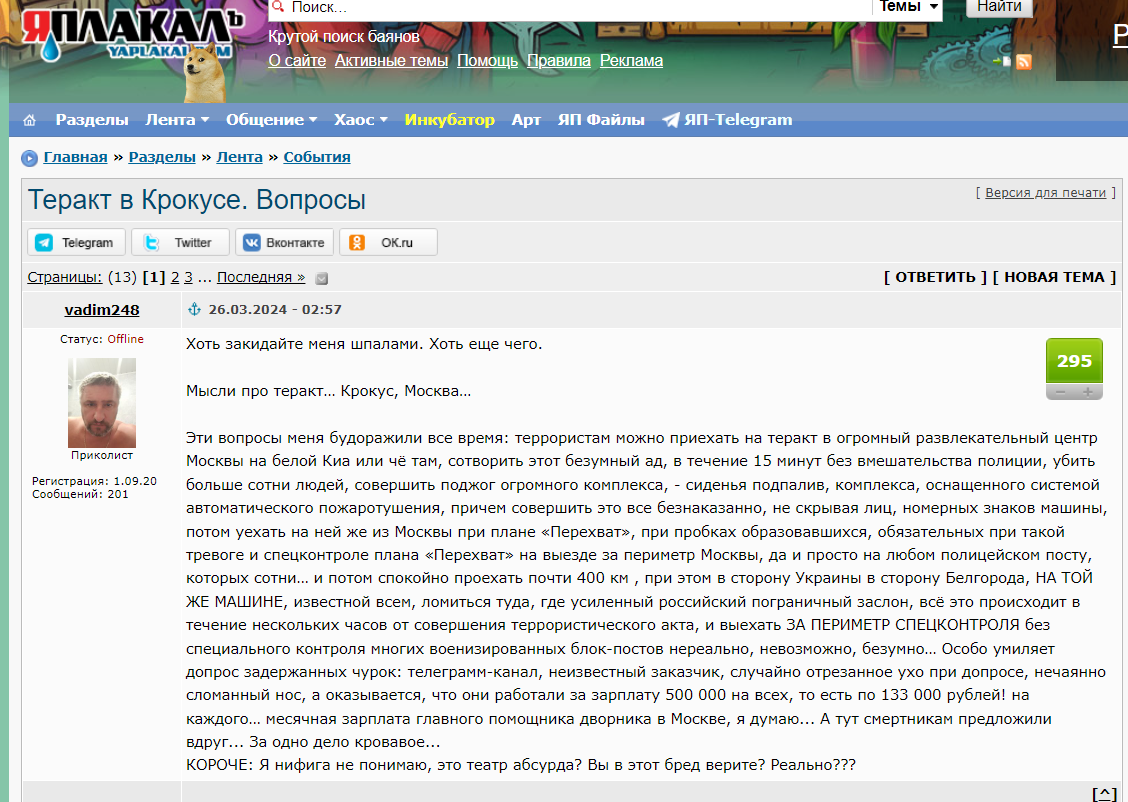 Here is another Yaplakal post, titled “Terrorist attack at Crocus. Questions”, that was up-voted to the forum’s front page: