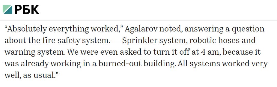 ▪︎ why didn’t the fire extinguishing system, which is supposed to prevent a tragedy, work? After all, it wasn’t a paper mill that was burning, but an essentially empty building, where, in theory, there was nothing to burn.