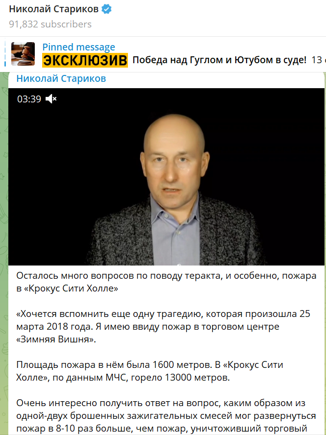 “I would like to remember another tragedy that occurred on March 25, 2018. I mean the fire in the Winter Cherry shopping center. The area of the fire was 1600 meters. In Crocus City Hall, according to the Ministry of Emergency Situations, 13,000 meters were burning.