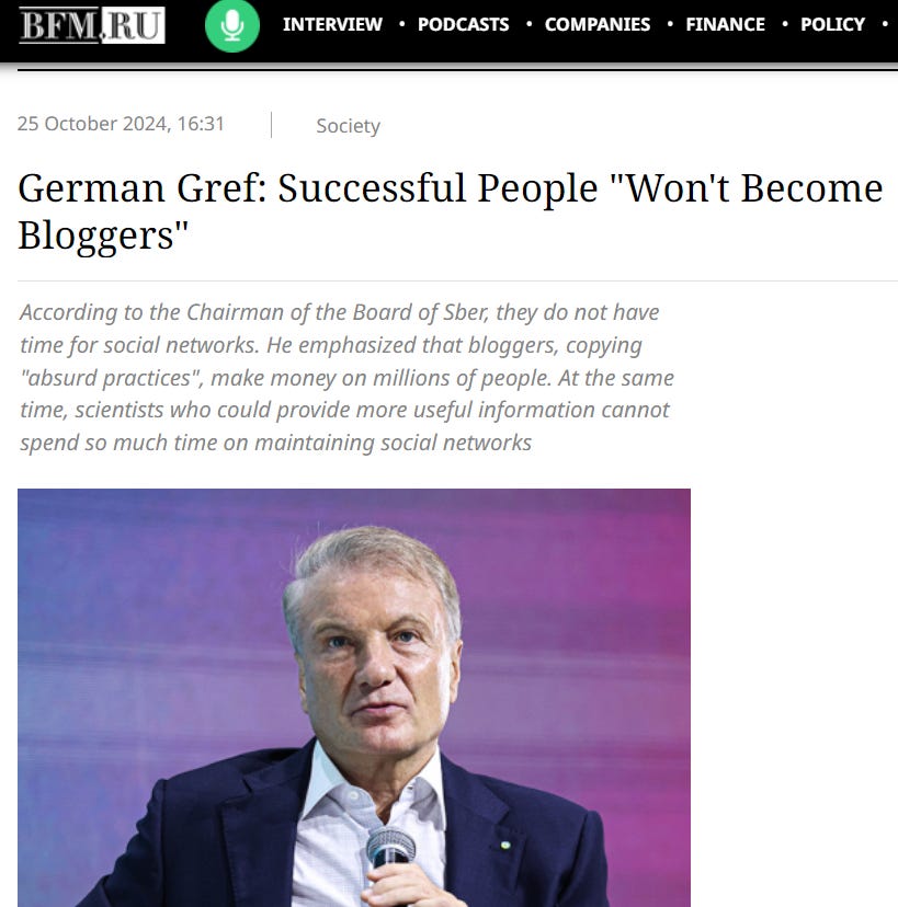 “It’s just awful to me, all these bloggers who haven’t achieved anything in life. Listen, if a person has achieved something in life, will he become a blogger? He doesn’t have time for that. And losers who can’t do anything else except chat, they become bloggers,” [Gref said while speaking at a SberUniversity conference at the end of October]