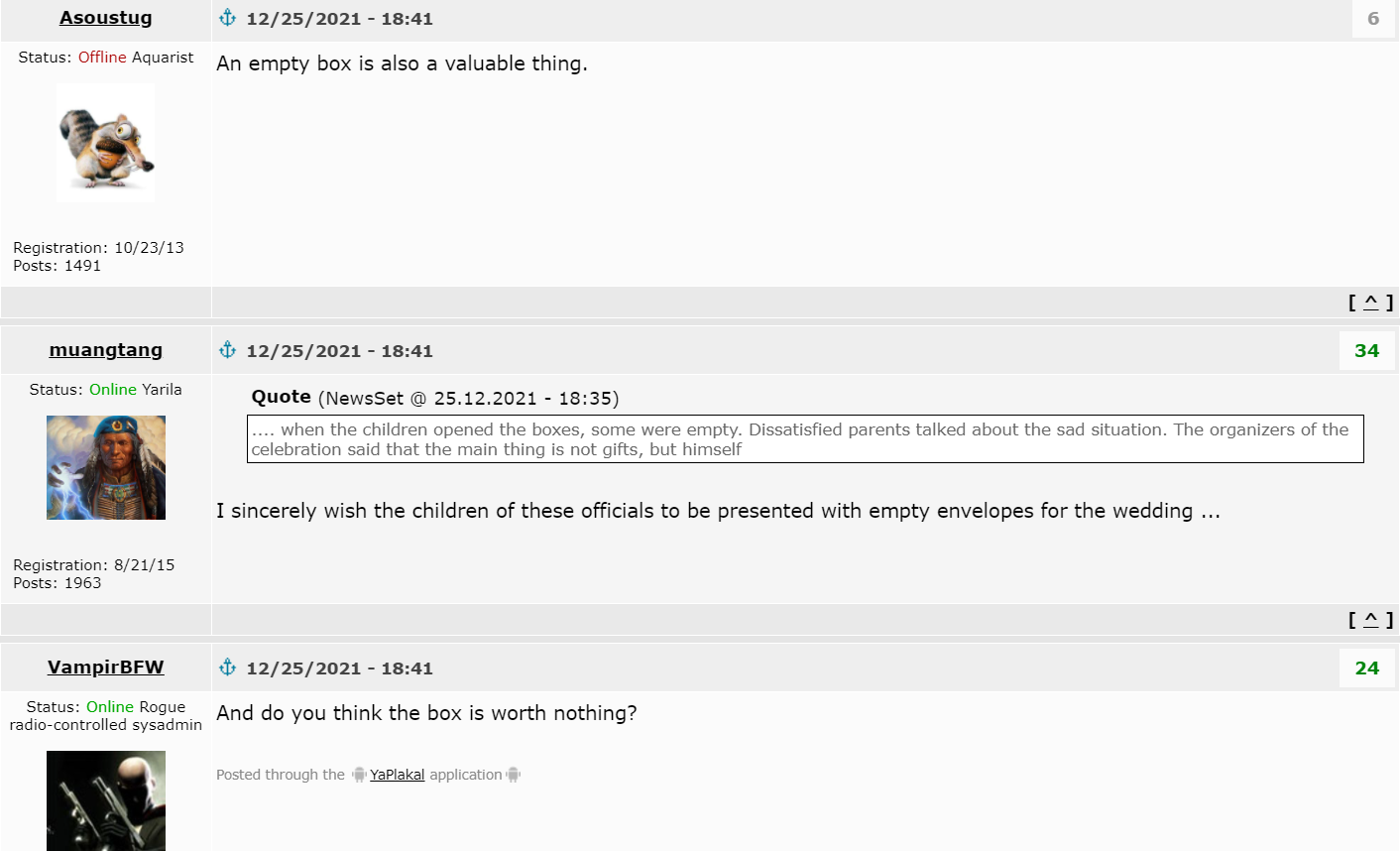 On December 22, a New Year event with the distribution of gifts was held in Demsky park [in Ufa], but some children found absolutely nothing in the gifted boxes—they were empty, according to the parents dissatisfied with the situation. […]