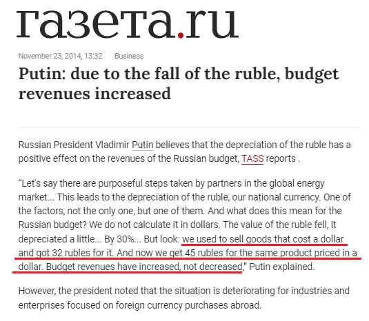 If you are selling stuff (like oil and gas), and you receive dollars and euros in exchange for this stuff (and you do, because the “rubles for gas” thing was actually just a barely disguised gimmick), then a “devalued” ruble means you get more rubles for your stuff. And that’s good, because your budget is in rubles, and now you have more money for the budget.