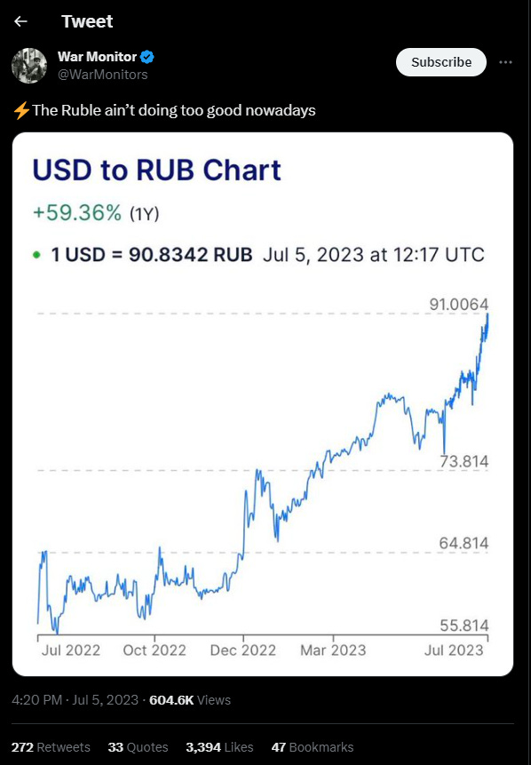 It was mildly amusing to watch certain unfortunate corners of the internet cheer for the “strengthening” ruble. Every time Russia’s currency “strengthens” by 1 ruble, the federal budget loses between 130-200 billion rubles in revenue. The 2023 budget is expected to be around 30 trillion rubles. So 200 billion rubles is not chump change. That’s a lot of hookah.