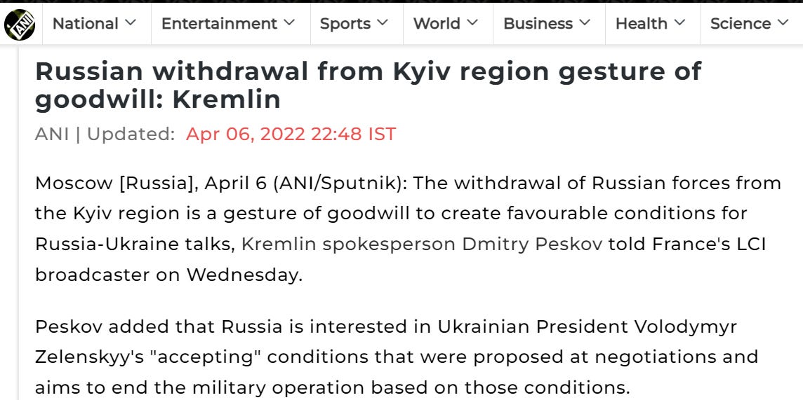 A week after Ritter published his Big Arrow treatise, Kremlin spokesman Dmitry Peskov announced on April 6 that Russian troops were pulling out from Kiev as a “gesture of goodwill” to create favorable conditions for peace talks with Zelensky.