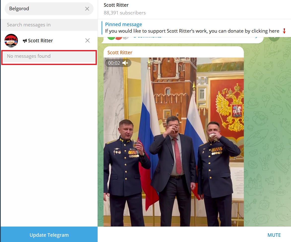 Coincidentally, Scott Ritter’s popular Telegram channel returns zero results when you search for “Belgorod”.