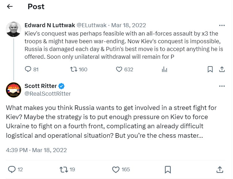 When the knockout blow failed to materialize, Ritter began chastising anyone with the chutzpah to suggest that the Russian military had ever intended to take Kiev.
