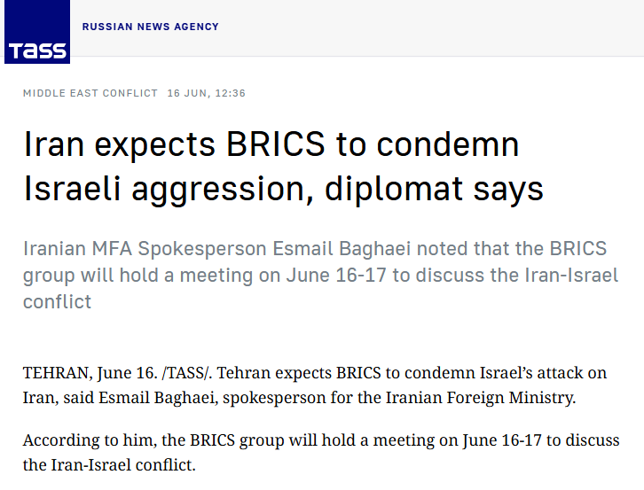 Infobrics.org, the joint website of the ministries of foreign affairs of the BRICS member states, has no information about the unlawful attacks against member state Iran. There’s also no mention of the June 16-17 BRICS consultations on the conflict.