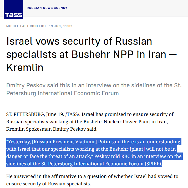 Even Moscow, which condemned Israel’s attacks (while only offering to “mediate” an end to the conflict, as opposed to providing material support to help Iran defend itself), has publicly acknowledged it has a gentlemen’s agreement with the Israelis.