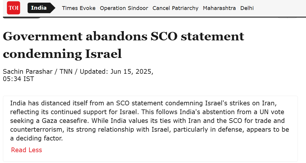 India has distanced itself from a [Shanghai Cooperation Organization] statement condemning Israel’s strikes on Iran, reflecting its continued support for Israel … [India’s] strong relationship with Israel, particularly in defense, appears to be a deciding factor.