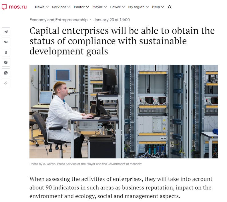 A few days later, the website for Moscow’s city government announced that businesses in the capital would be able to receive “the status of compliance of organizations' activities with the Sustainable Development Goals (SDGs)—ESG status”.