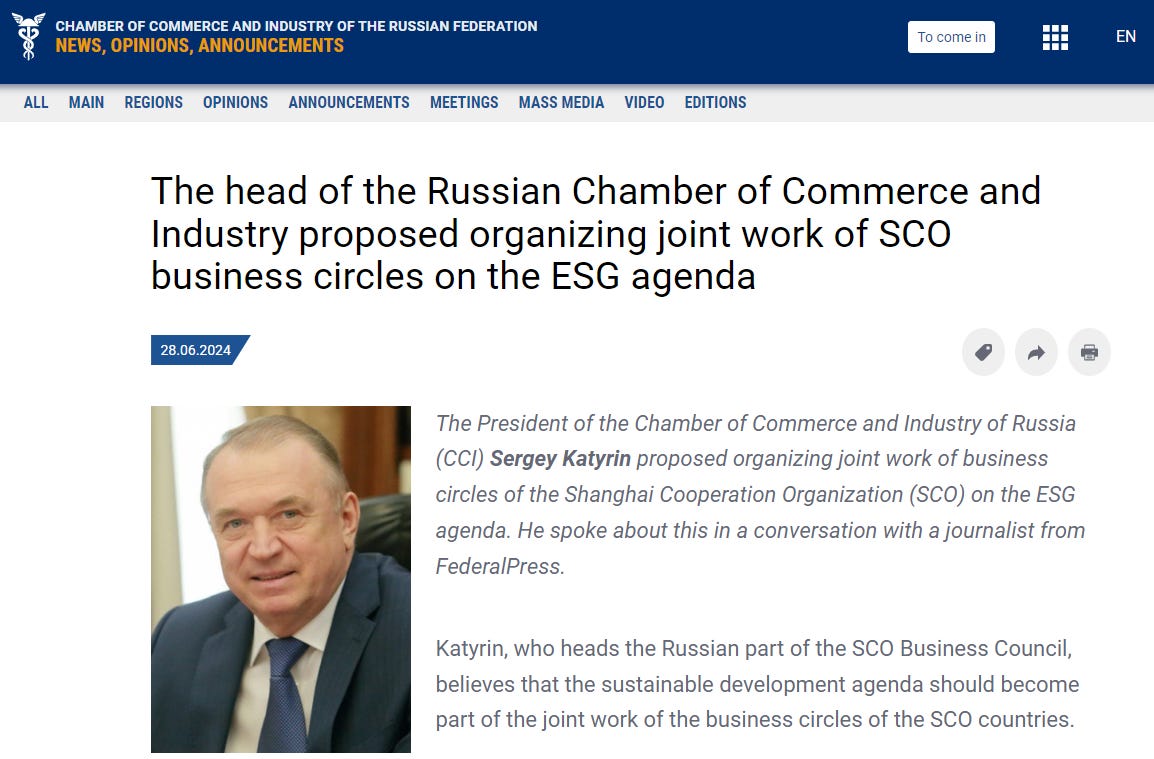 Business leaders in Russia are interested in cooperating with the Shanghai Cooperation Organization (SCO) to further the goals of the “ESG agenda”, Sergey Katyrin, the president of the Chamber of Commerce and Industry of Russia, said at the end of June.