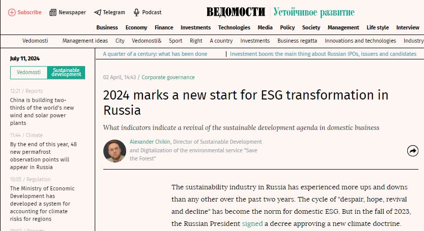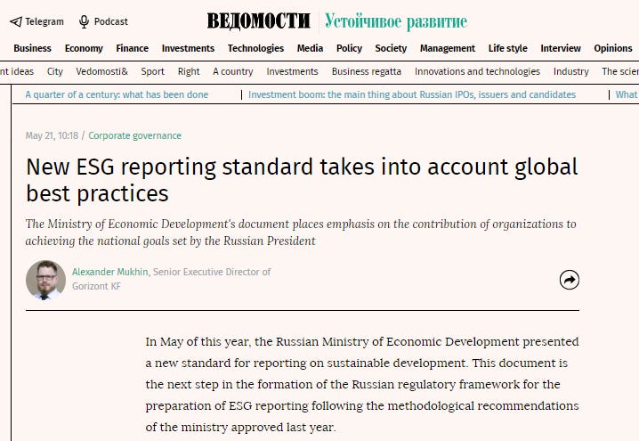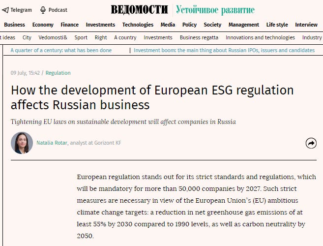 To top it all off, a recent article in Vedomosti explained how Russian businesses were eager to comply with EU ESG regulations. Yes, the same European bloc that is currently pouring weapons into Ukraine. Sure, why not?
