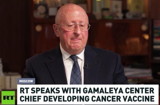 Gintsburg explained in June that his genetic cancer cure was “based on mRNA technologies [used to create] the Pfizer and Moderna COVID-19 vaccines”.