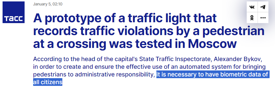[The head of Moscow’s State Traffic Inspectorate, Alexander Bykov,] noted that in order to create and ensure the effective use of an automated system for bringing pedestrians to administrative responsibility, it is necessary to have biometric data of all citizens. In this case, the submission of biometric data should become an obligation of citizens.