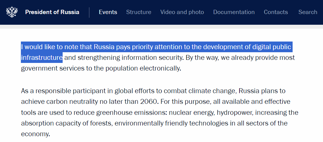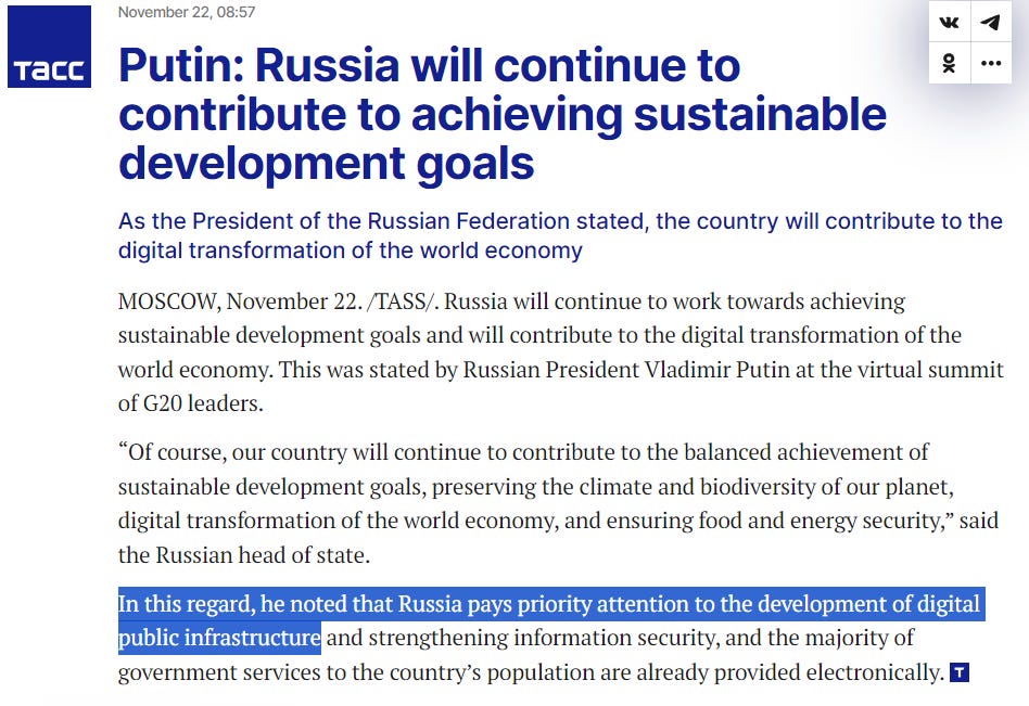 I am pointing this out because Vladimir Putin announced at November’s G20 summit that “the development of digital public infrastructure” was a “priority” for the Russian Federation.