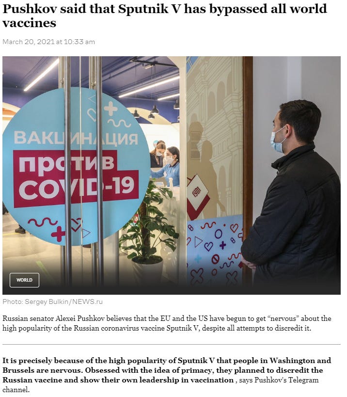 Curiously, I can’t find a single comment from Pushkov—on Telegram or while pontificating in the Senate chambers—about the fact that Russia hopped into bed with AstraZeneca, or that Sputnik V is a crude AstraZeneca clone whose clinical trial data has been classified by the Russian Health Ministry as a “trade secret”. Not a single word about any of this—very weird.