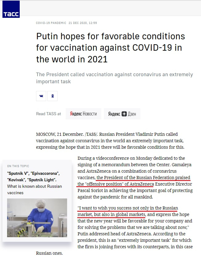 Anyway, no one could accuse Moscow of being unsportsmanlike during the Race to Protect Public Health. Putin even wished the CEO of AstraZeneca “success not only in the Russian market, but also in global markets.”