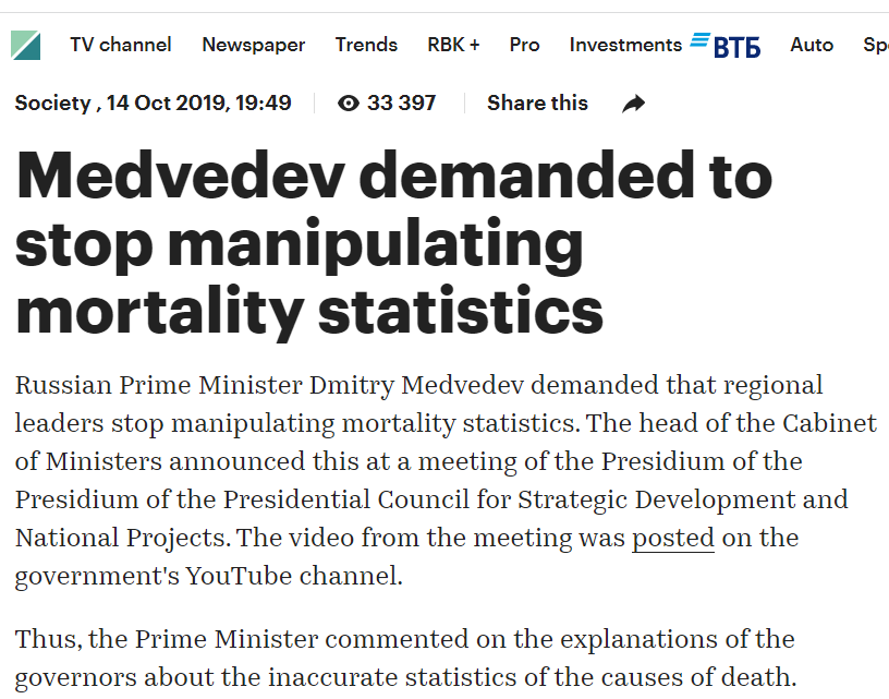 This is the same government that for half a decade fabricated mortality rates as part of a “public health” initiative. It was a really great initiative. Everyone became much more healthy, on paper. Eventually the hoax became so blatant and embarrassing that it was physically impossible to cover it up (although Russia’s benevolent public servants certainly tried!).