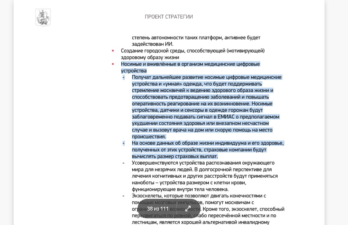 Wearable digital medical devices and smart clothing will be further developed, which will support the desire of Muscovites to maintain a healthy lifestyle and help prevent diseases and increase the responsiveness to their occurrence. Wearable devices, sensors and sensors in the clothes of residents will send a signal to UMIAS [Unified Medical Information Analysis System, which already exists] in advance about an alleged deterioration in health or a sudden accident and will call a doctor at home or an ambulance to the scene.