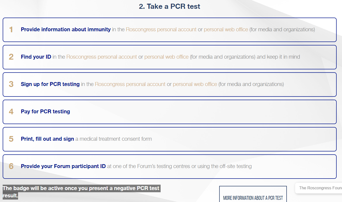 As per tradition, you will not be allowed to enter the venue without a negative PCR test. SPIEF published a helpful video if you have questions about your Virus Status: