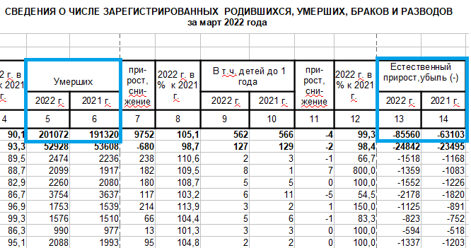 At the same time, the number of deaths from coronavirus amounted to 30.2 thousand people in March against 37.9 thousand in February and 32.4 thousand in January. The total number of Russians who have died since the beginning of the year has reached 584.7 thousand. The number of births in the first three months amounted to 320.4 thousand. As a result, the natural population decline has grown to a new historical anti-record - 264.3 thousand people in the first quarter of the year.