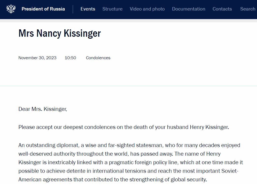 "I will undoubtedly retain the fondest memory of him" Putin wrote in a message expressing his condolences to Kissinger's wife