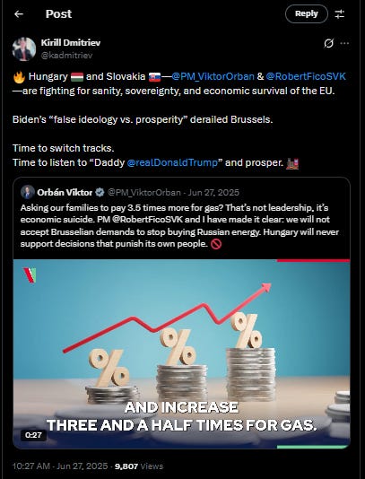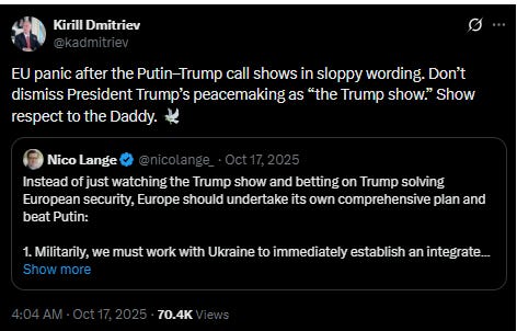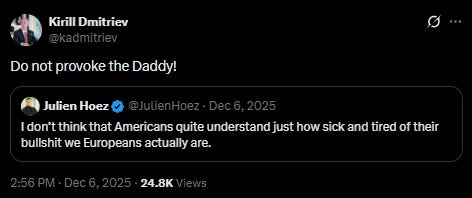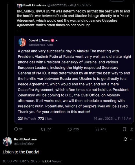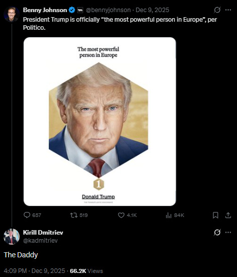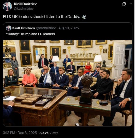 I understand that the “daddy” meme comes from Mark Rutte’s strange NATO summit outburst, but Kirill is not using this moniker to merely portray European leaders as Washington’s lapdogs. He apparently believes it’s good diplomacy—a sign of respect—to call the president of a nation that is directly and indirectly killing Russians every day, “daddy”.