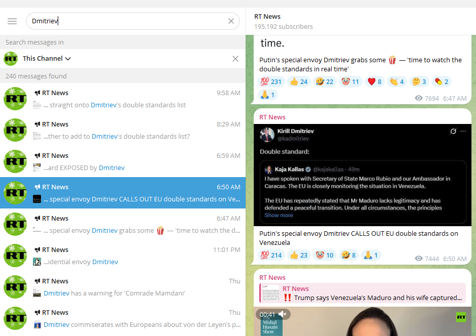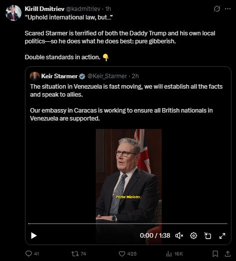 Meanwhile, RT’s social media team has been ordered to share every unfortunate word that dribbles out of Dmitriev’s mouth-hole: