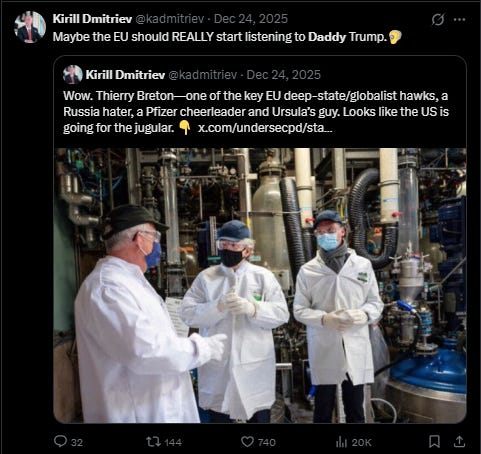 But Kirill Dmitriev is not your uncle (or if he is, my condolences). Kirill is Vladimir Putin’s “special representative of the Russian president for investment and economic cooperation with foreign countries”.