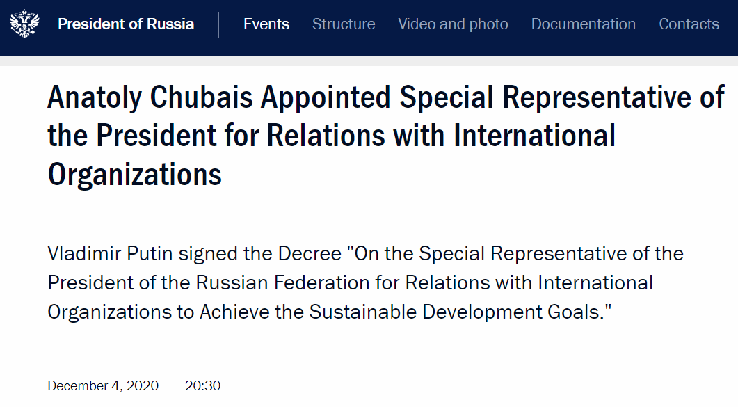 On December 4, 2020, Putin announced Chubais would serve as his “sustainability” emissary to “international organizations.”