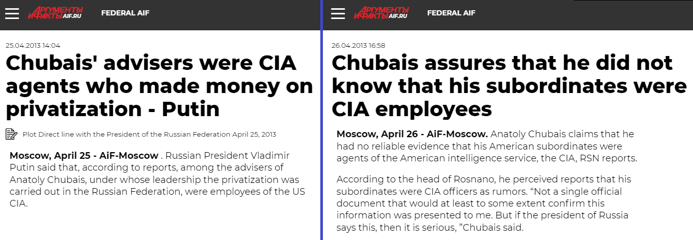 For example, in 2013, Putin claimed Chubais’ devastating privatization campaign had been carried out by creeps on the CIA’s payroll. Although he acknowledged the “serious” nature of these claims, Chubais insisted he was unaware of any evidence that his subordinates had been working for Langley.