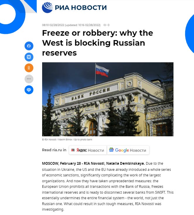 Russia’s state-run RIA Novosti described the foreign reserves freeze as a “robbery” and warned of economic chaos on a global scale: