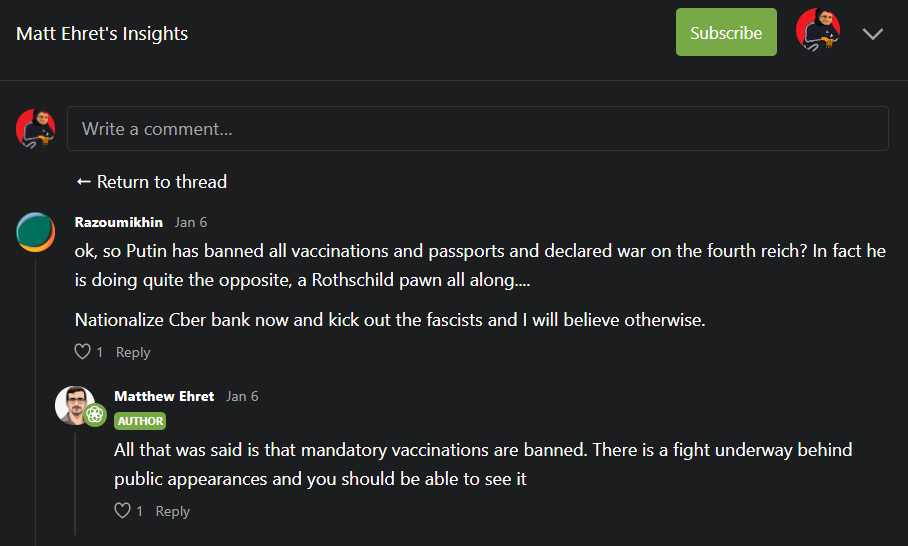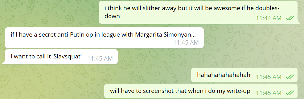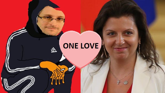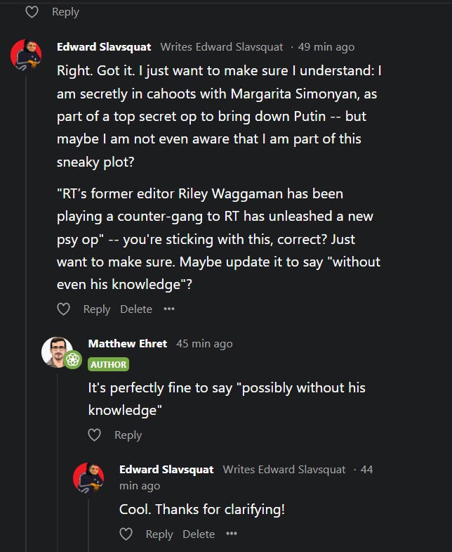 The Substack blog that writes about the “total nihilism, laziness and institutionalized cowardice that permeates through RT” and refers to RT’s editor-in-chief, Margarita Simonyan, as a “confirmed schizo”—this same blog is in bed with Simonyan (gross) and is actively pursuing high treason with her. Or so the theory goes.