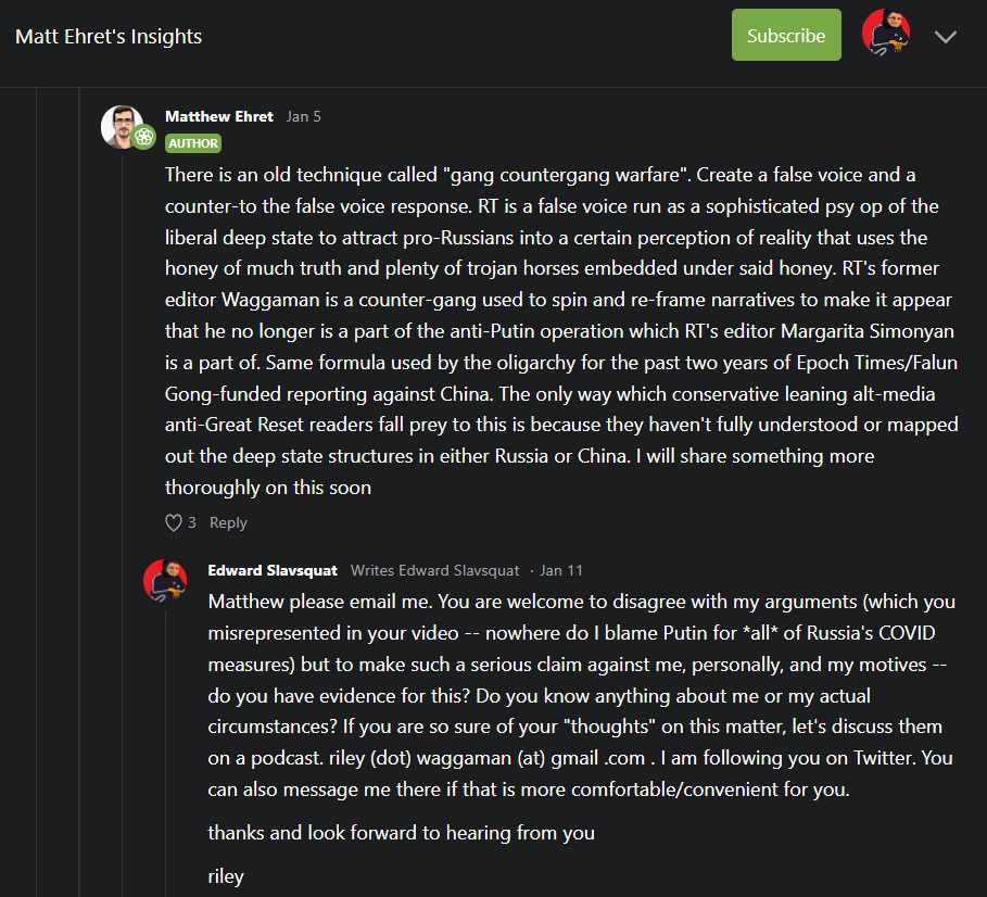 “RT’s former editor Riley Waggaman has been playing a counter-gang to RT [and] has unleashed a new psy op to convince a western audience that Putin is a complicit part of the anti-human Great Reset agenda.”
