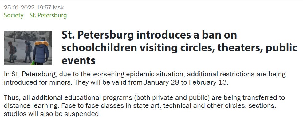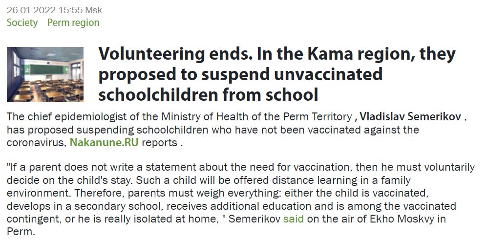 And that’s just healthcare-related shenanigans. What other cold-like symptoms nonsense is going on in Russia’s lesser-known regions? One example: in Perm, the regional public health junta wants to segregate uninjected children: