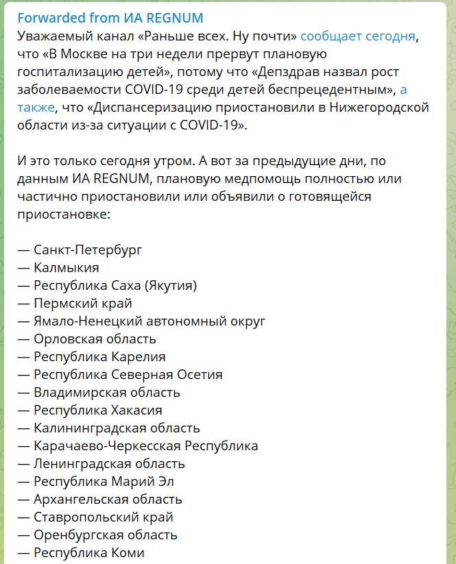 According to Regnum, planned or routine medical care has been restricted or completely suspended in the following regions: Saint Petersburg, Kalmykia, Republic of Sakha (Yakutia), Perm region, Yamalo-Nenets Autonomous Okrug, Oryol region, Republic of Karelia, Republic of North Ossetia, Vladimir region, Republic of Khakassia, Kaliningrad region, Karachay-Cherkess Republic, Leningrad region, Mari El Republic, Arkhangelsk region, Stavropol region, Orenburg region, Komi Republic, Rostov region, and Moscow region.