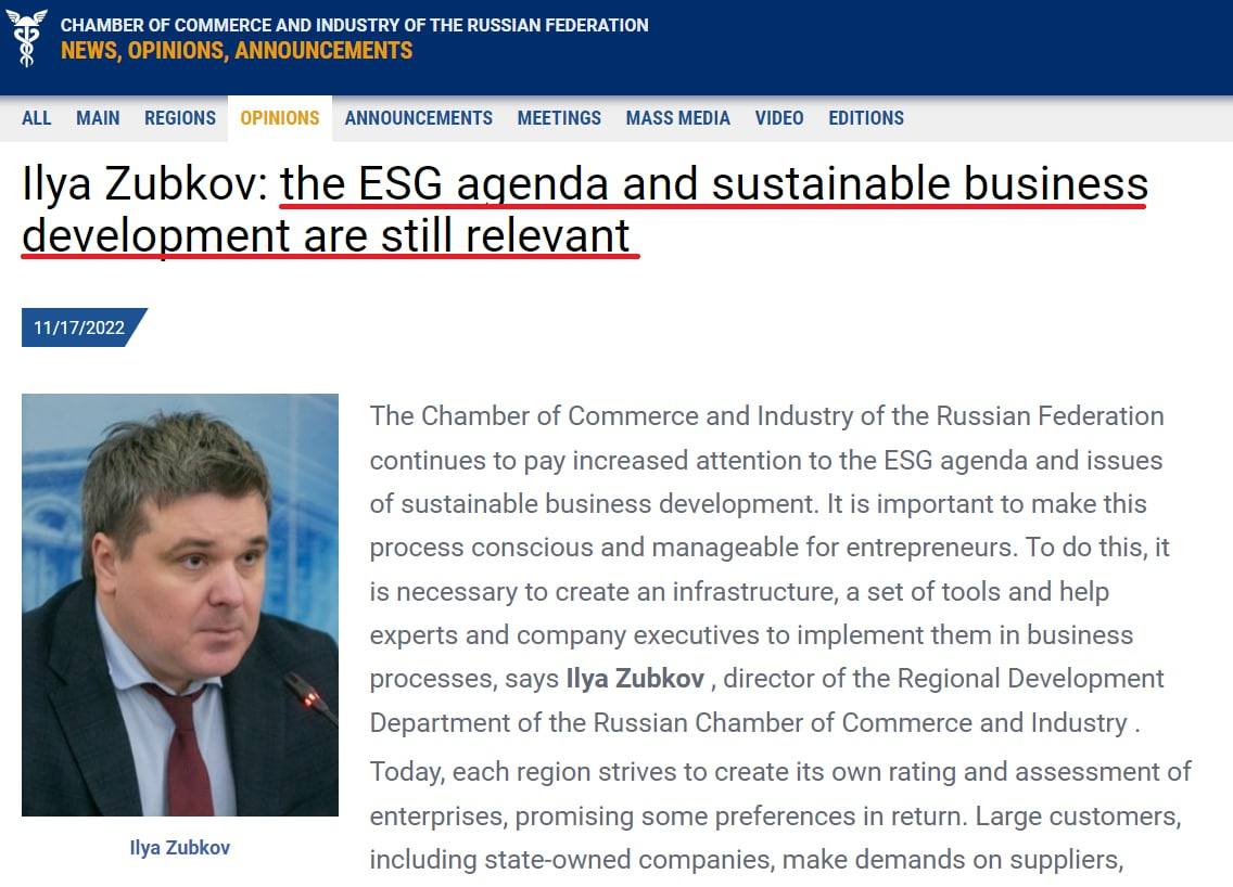 The sustained enthusiasm for all things ESG was expressed in an op-ed published by Russia’s Chamber of Commerce in November.
