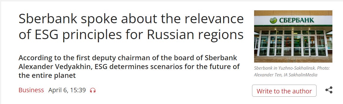 On April 6, the first deputy chairman of the board of Sberbank, Alexander Vedyakhin, extolled the ESG agenda and predicted it would “determine what the future of the planet will be like for decades to come.”