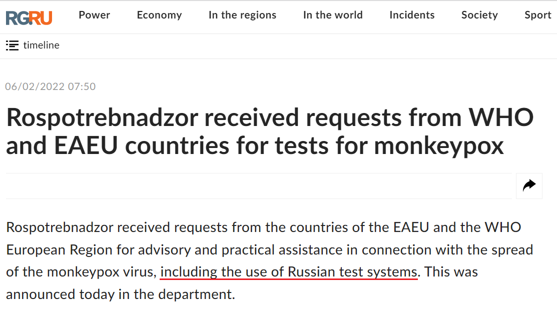 Russia’s federal agency for “human wellbeing,” Rospotrebnadzor, proudly announced on Thursday that it had “received requests from the countries of the [Eurasian Economic Union] and the WHO European Region for advisory and practical assistance in countering the spread of the monkeypox virus, including the use of Russian test systems. If necessary, appropriate assistance will be provided to partners.”