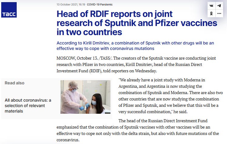 Dmitriev knows a thing or two about combining “our minds and technology to serve the glory of humanity”. As head of the Russian Direct Investment Fund (RDIF), he brokered a deal that turned Russia into a manufacturing and distribution hub for AstraZeneca’s COVID shot. The Russian government later teamed up with AstraZeneca to test a Sputnik V-AstraZeneca “cocktail”. Dmitriev was also instrumental in organizing joint COVID “vaccine” research with Pfizer, hypothesizing that a Pfizer-Sputnik V hybrid goo would be “a very successful combination”.