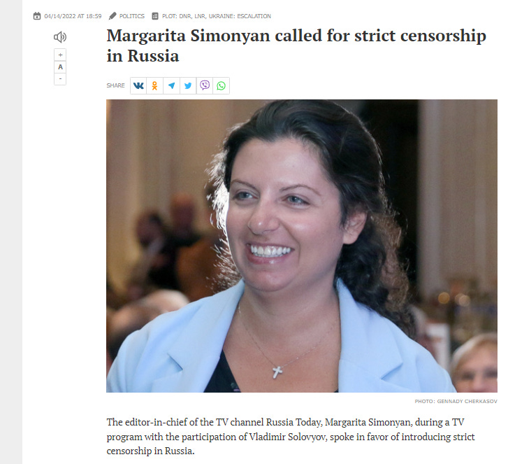RT should not be kicked off the air—anywhere. Also, RT’s editor-in-chief should not be calling for censorship inside Russia. Why do that? The situation is bad enough already. Don’t make it worse, please?
