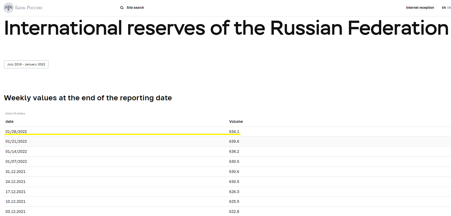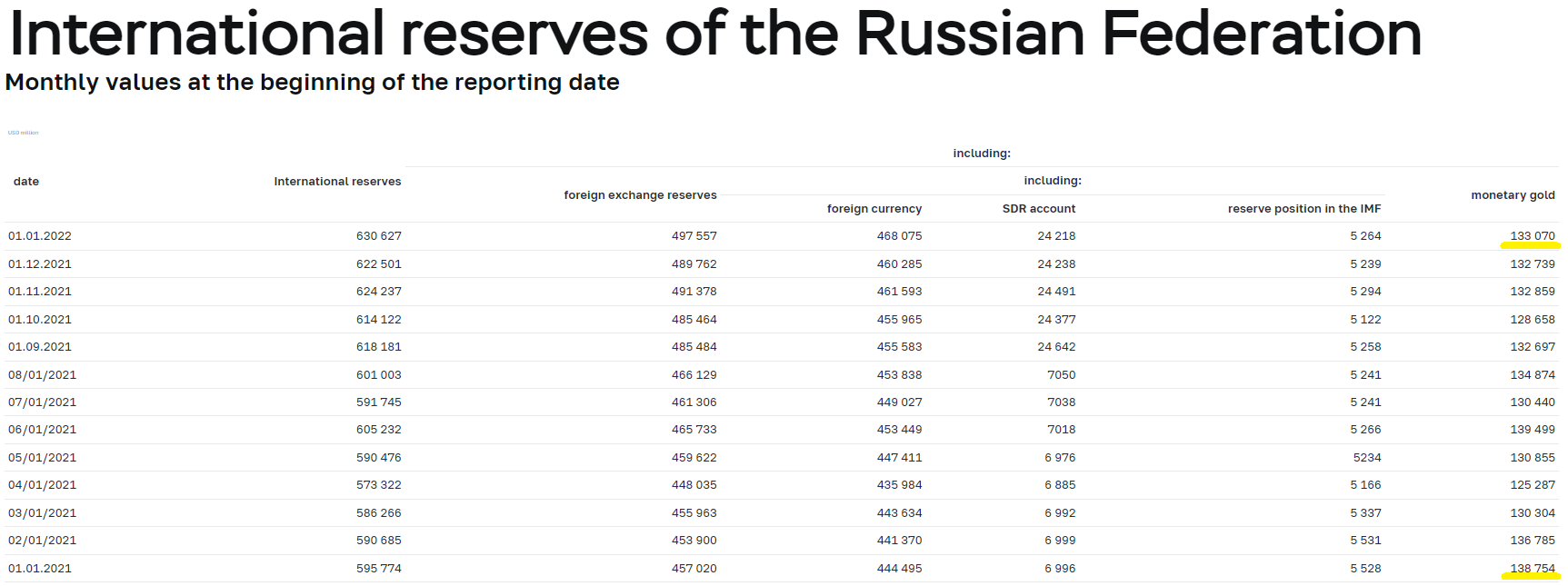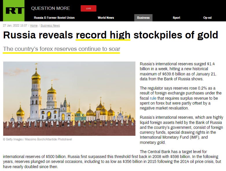 There’s not a single word about Russia’s “record high” mountain of gold. RT’s article is a very greasy repackaging of a press release announcing that the value (in US dollars) of the central bank’s total international reserves (gold + everything else) hit an all-time high of $639.6 billion on January 21. This makes sense because in late January, the price of gold briefly shot up.