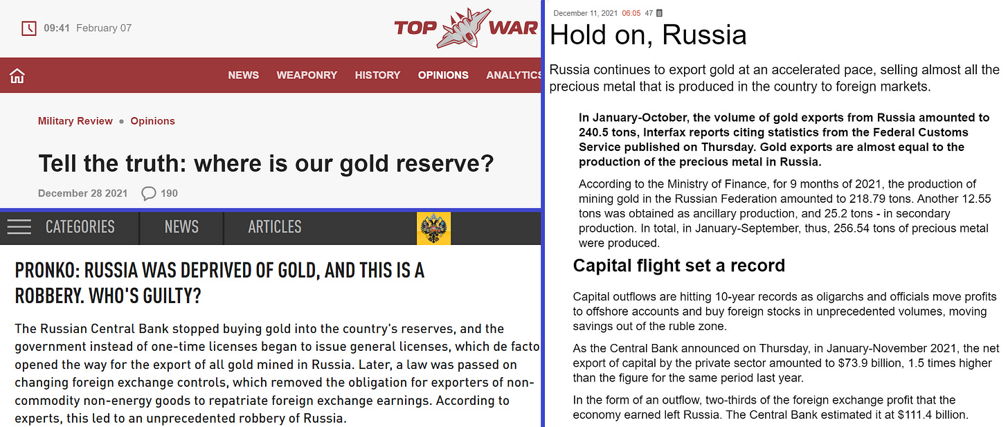 Readers of this blog will likely be familiar with the following chronology of events: 1) On March 30, 2020, the Bank of Russia announced it would halt gold purchases. 2) In April 2020, the Russian government decided to ease restrictions on the export of gold and began issuing licenses to gold mining companies to sell their shiny metal abroad. 3) In June 2021, Putin signed a law that canceled requirements for the repatriation of foreign exchange earnings from gold exports. 4) By November 2021, Russia’s gold miners were exporting almost everything they produced. 5) In late December 2021, the State Duma requested information about why the central bank had stopped purchasing gold. 6) Russian news outlets are now yelling about “an unprecedented [gold] robbery” and have accused the Russian government of legalizing a new form of capital flight.