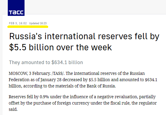 If the central bank made a gold purchase that hasn’t been reported yet, it clearly wasn’t large enough to offset the price plunge at the end of January. As TASS reported on February 3, Russia’s international reserves fell by $5.5 billion over a seven-day period: