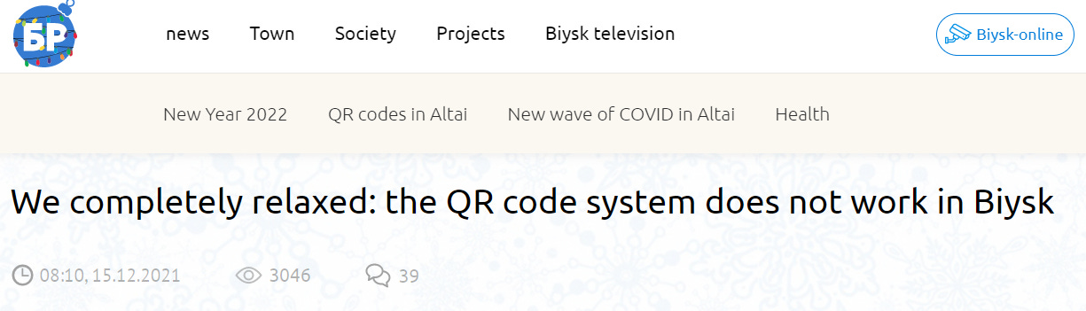 REGNUM, citing local media, reported that a city in Altai gave up on enforcing QR codes in their shopping centers—partly due to the “very aggressive attitude of citizens towards the procedure”: