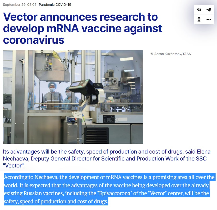 According to [Elena] Nechaeva, [deputy director of the Vector center], the development of mRNA vaccines is a promising area all over the world.